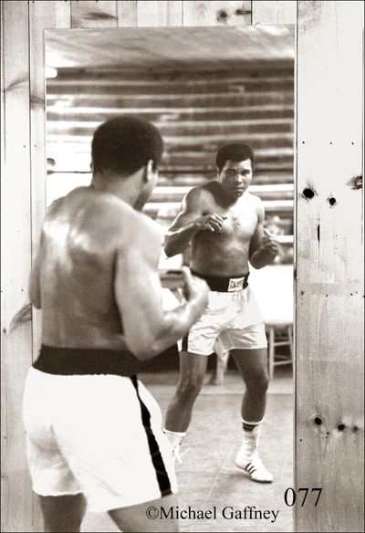 The legendary Muhammad Ali checks his skills while mirror boxing at his Deer Lake Boxing Camp. Champ felt that all his celebrity and fame that he earned in boxing were for the purpose of creating a greater good for others. He felt a responsibility to be an inspired leader for his fans to believe in. This was the driving motivational force for Ali to stay competitive and at the top of his game.