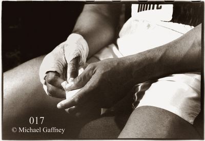 These hands changed the world of boxing. The greatest lateral movement and the fastest hand speed and foot speed had never been seen before in a heavyweight fighter. Ali's speed, durability, heart and ring generalship were among the best ever. These hands that won 56 fights, 37 by knockout with 5 losses are being taped before the Earnie Shavers fight at Madison Square Garden, September 29, 1977.